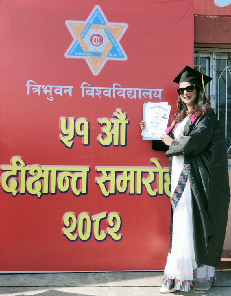 अन्त्यमा, मेरो सफलतामा साथ दिनुहुने सबैप्रति हृदयदेखि कृतज्ञता प्रकट गर्दै निरन्तर यात्राको वाचा गर्दछु । ५१ औँ दीक्षान्त समारोहको यो गर्भिलो क्षणमा दाजु र श्रीमानज्यूको साथमा खुसी छु अझ छोराछोरी र आमाबुबाहरूसँग बसेर खुसी बाड्ने इच्छा थियो । विविध कारणले असमर्थ भएपनि भौतिक रूपमा रहेको यो उपलब्धिलाई आत्मिक रूपमा यिनै शब्दहारमार्फत मेरा आमाबुबा, सासूससुरा र छोराछोरीलाई सुशोभित गर्दछु ।