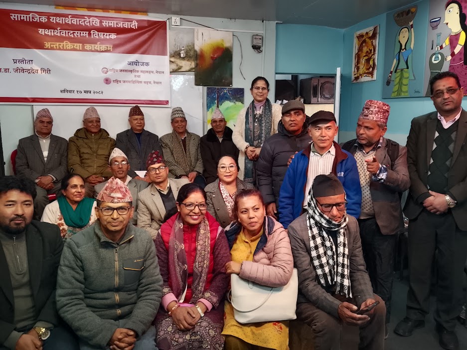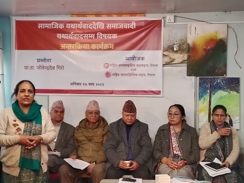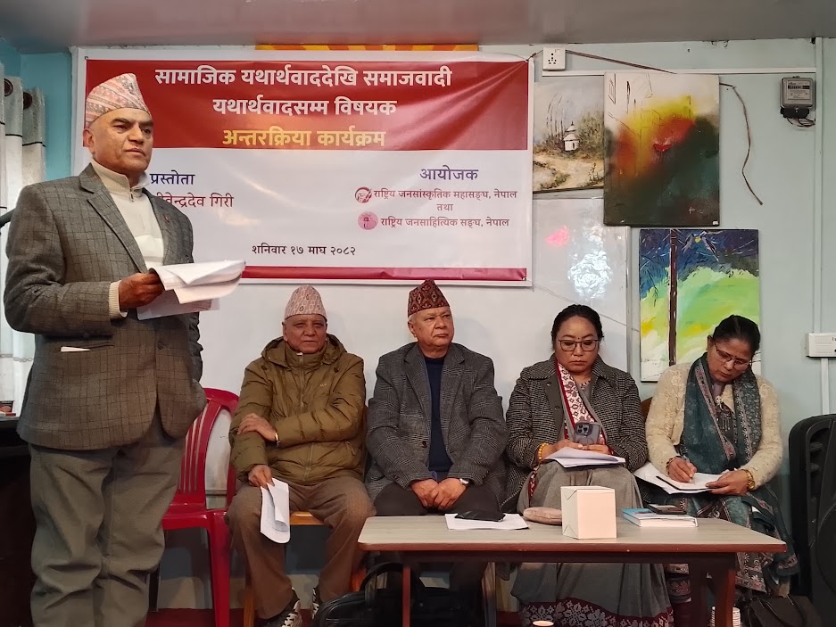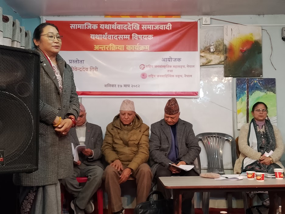 काठमाडौं, माघ १७ – जनसांस्कृतिक महासङ्घको कार्यालय, पुतलीसडकमा आज “सामाजिक यथार्थवाददेखि समाजवादी यथार्थवादसम्म” शीर्षकमा विचार गोष्ठी सम्पन्न भएको छ। उक्त कार्यक्रमको सभापतित्व महासङ्घका अध्यक्ष भूमिका सुब्बाले गर्नुभएको थियो।